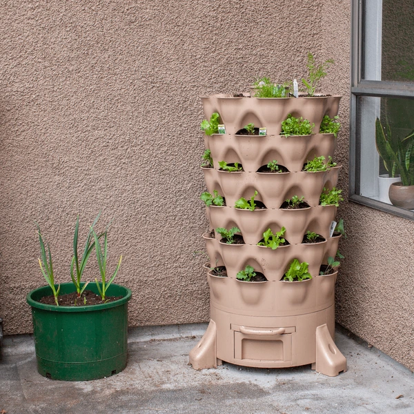 How it works: A vertical planter with a compost column in the center. Food scraps go in the center, and worms move nutrients to the plants.