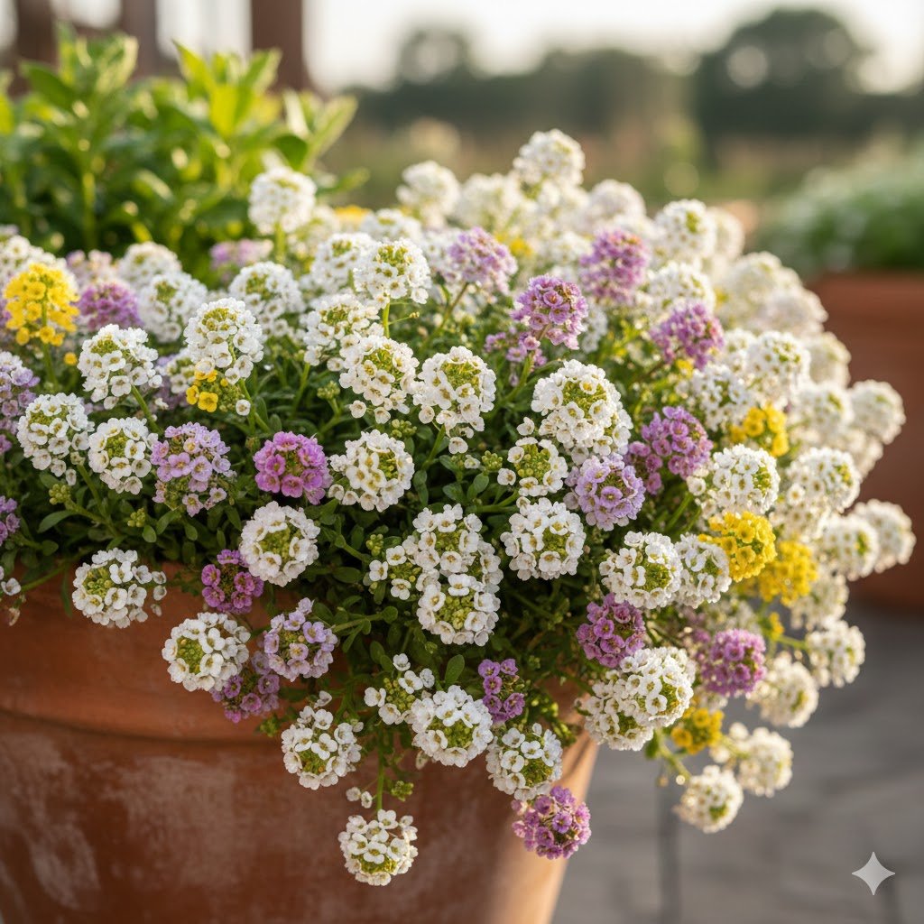 I use alyssum to soften the edges of larger pots. It fills gaps and adds fragrance without taking over.
