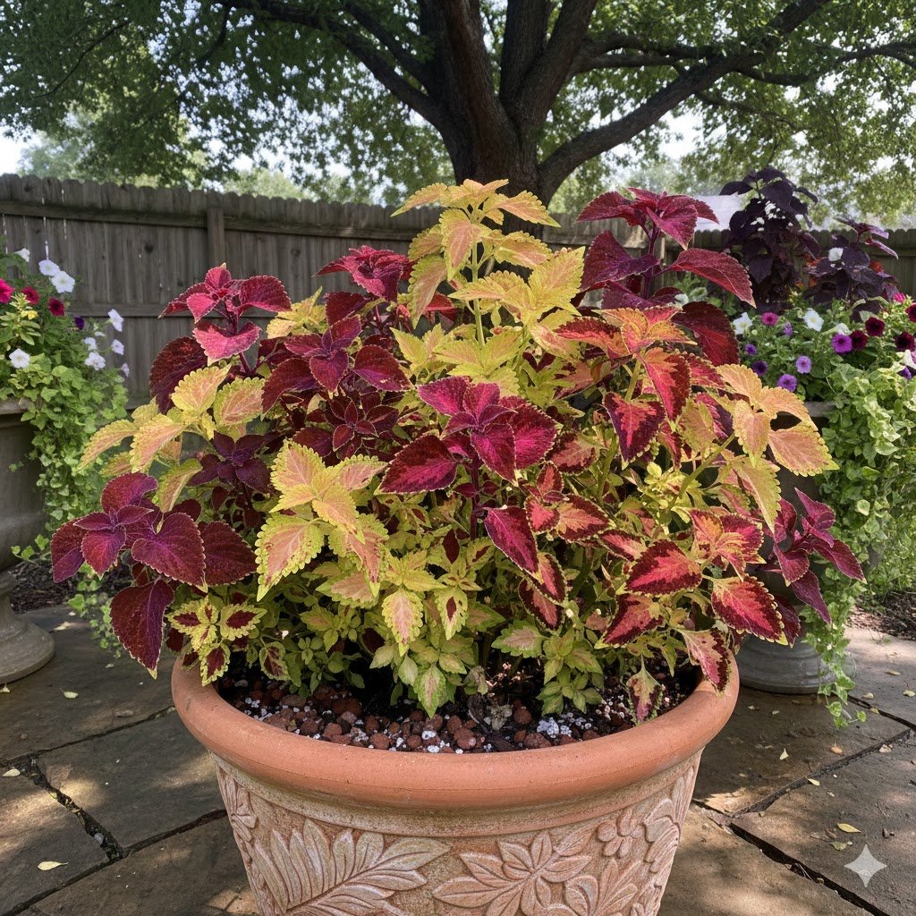Coleus is technically grown for leaves, but I treat it like a flower because it adds color without blooms. Some varieties outshine actual flowers.
