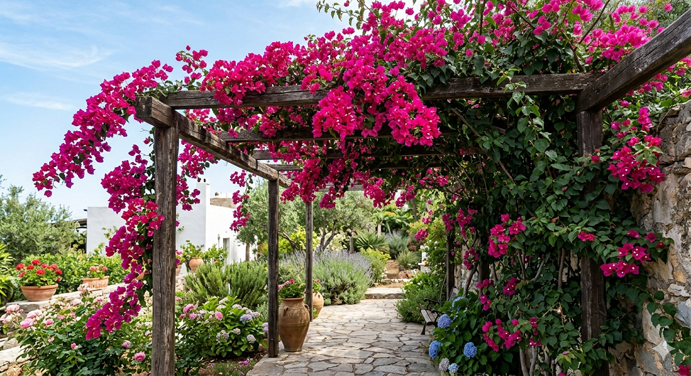 If you live in Zone 9 or higher, Bougainvillea is the king of climbers. The “flowers” are actually papery bracts that come in colors so bright they look like neon signs—magenta, orange, electric purple. They love the heat and they actually bloom better if you “abuse” them a little.