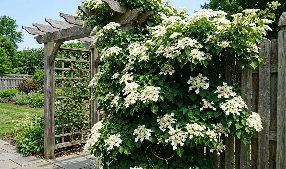 One side note for the impatient: if you want the look but don’t want to wait five years, look for Schizophragma hydrangeoides (False Hydrangea Vine). It looks almost identical but tends to bloom a bit sooner in its life cycle. I have both, and honestly, they’re both winners.