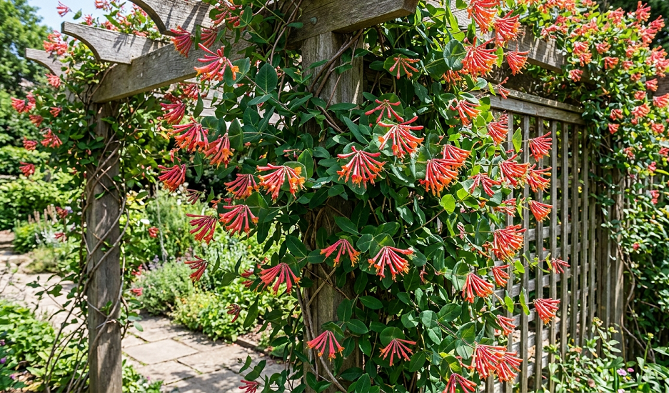 Go for the ‘Gold Flame’ or ‘Major Wheeler’ (Trumpet Honeysuckle). These are native to North America, they aren’t invasive, and hummingbirds will fight each other for a spot on these vines. ‘Major Wheeler’ is a powerhouse—it’s a solid wall of red tubes all summer long.