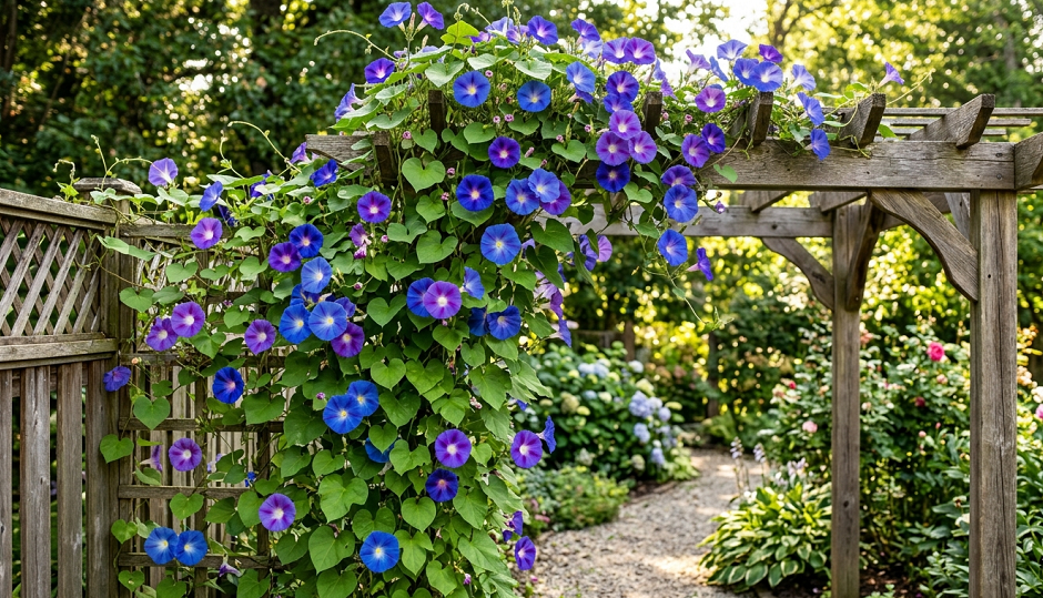 Be warned: they reseed like crazy. If you plant them once, you will have them forever. Some people call them weeds because of this, but honestly, I’d rather pull a few extra seedlings in May than have a bare fence. The ‘Heavenly Blue’ variety is the gold standard—it’s a blue so bright it almost looks fake.
