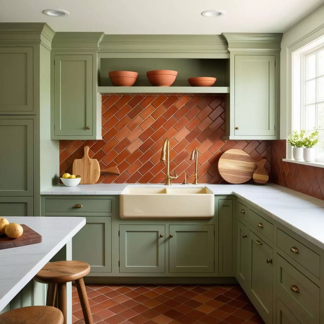 Use terracotta on the floor tiles or a feature wall, while olive green can shine on cabinetry or open shelves. The combination creates a rustic, worn-in look that feels both global and timeless. It’s a great choice for boho, eclectic, or Tuscan-style kitchens.
