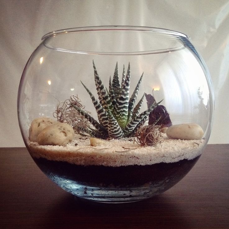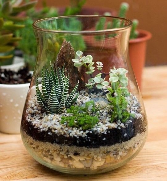 When putting together a succulent terrarium, always go for an open container. Succulents need airflow and dry conditions to thrive. I usually start with a layer of small stones, followed by activated charcoal, and then a gritty soil mix.