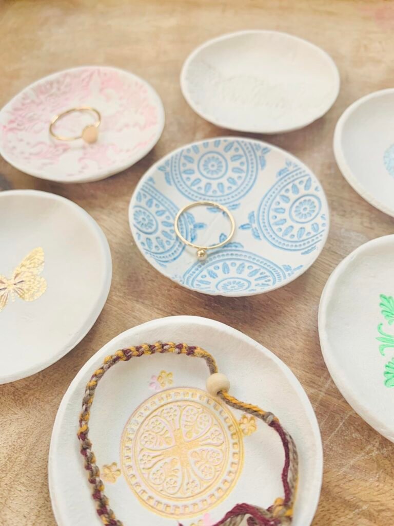 Kids can shape the clay by hand or press it into shallow bowls to create a base. Once the basic shape is formed, they can add texture using leaves, stamps, or textured fabrics. After drying (usually 24–48 hours), they can paint their dishes in bold colors, metallics, or even marbled effects using swirled paints.