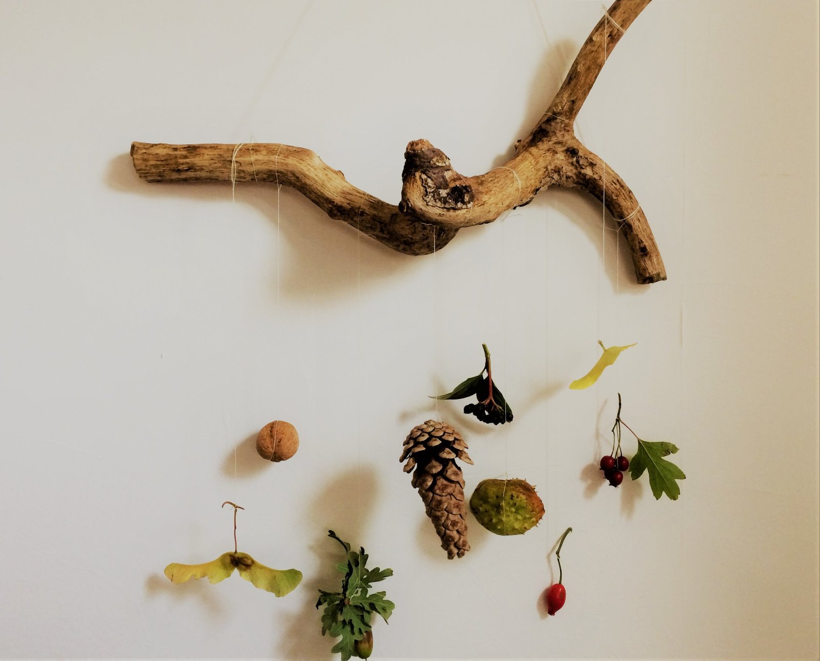 5. Balancing Act: Tie the prepared natural materials with hanging loops to different sections of the main twine or string, ensuring the mobile hangs evenly. Experiment with the placement of different materials for a balanced and visually appealing design.