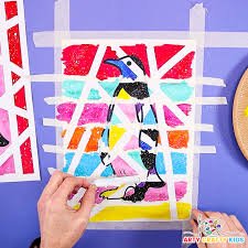 Kids start by applying painter’s tape to a blank canvas in patterns like stripes, zig-zags, or starbursts. They then paint over the entire surface using bold acrylic colors, blending or layering as they go. Once the paint dries, they peel off the tape to reveal crisp, clean lines and unexpected designs.