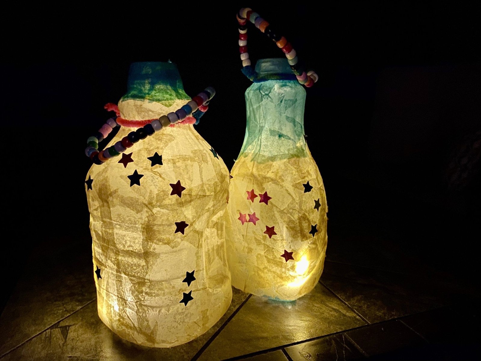 4. Let There Be Light: Once dry, carefully place a battery-operated tea light or a string of fairy lights inside the jar. These lanterns can be used to decorate cabins or hung outdoors for a magical campfire ambiance (ensure proper hanging methods and adult supervision around open flames).