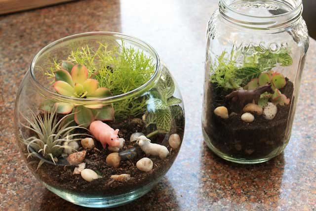 Gather small containers like clear plastic dessert cups or jars, and fill the bottom with pebbles or sand. Then, kids can add layers of faux moss, colorful beads, mini plants, or even fairy garden accessories. Figurines of animals, gnomes, or even LEGO characters make the scene come alive.