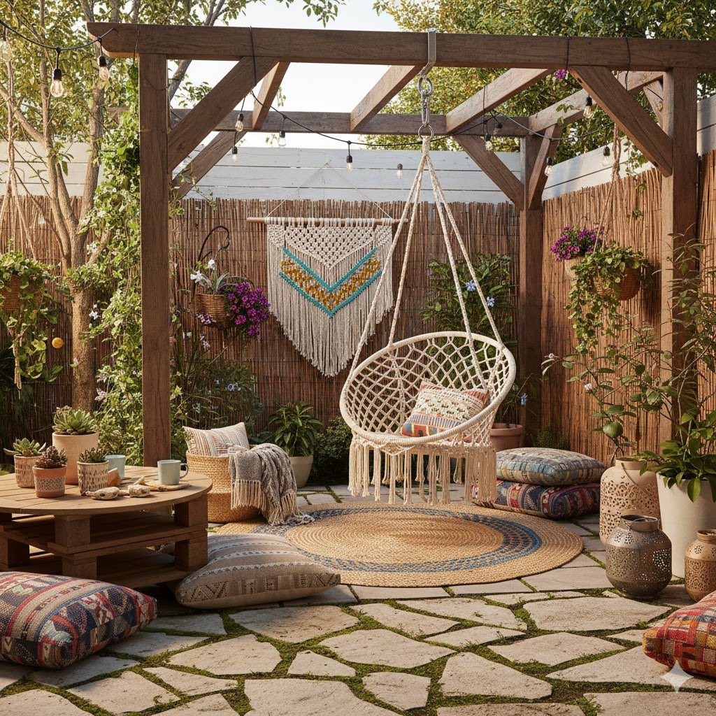 If you haven’t sat in a macramé swing chair with a glass of iced tea, have you even lived? These are the crown jewels of boho patio design. They take up zero floor space because they hang from the ceiling (or a sturdy tree limb), making your small yard feel much more open.
