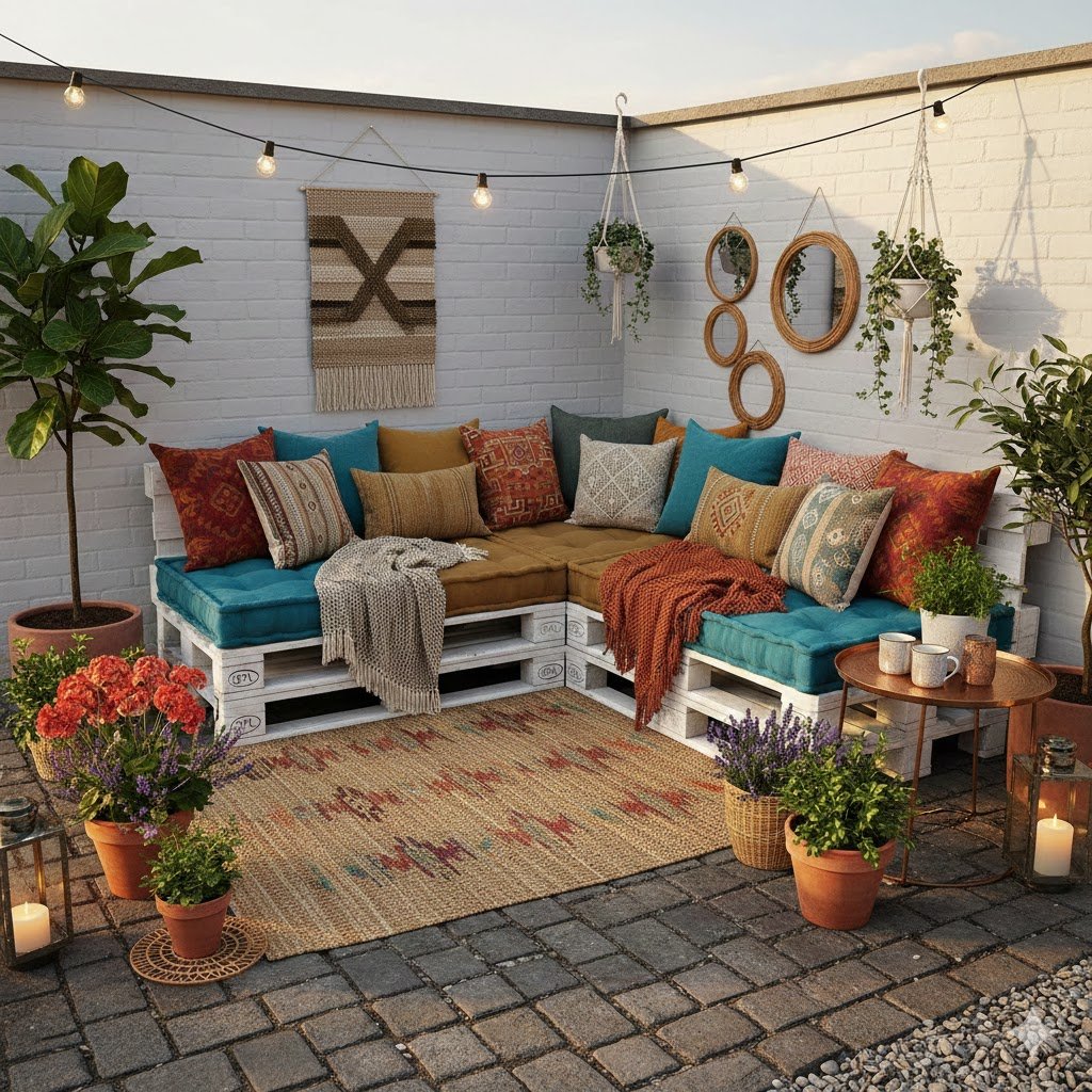Boho style is all about the gathering. Put your low-profile pallet sofa on one side and some floor cushions on the other. It creates a cozy, campfire feel that makes your backyard the go-to spot for Friday nights.