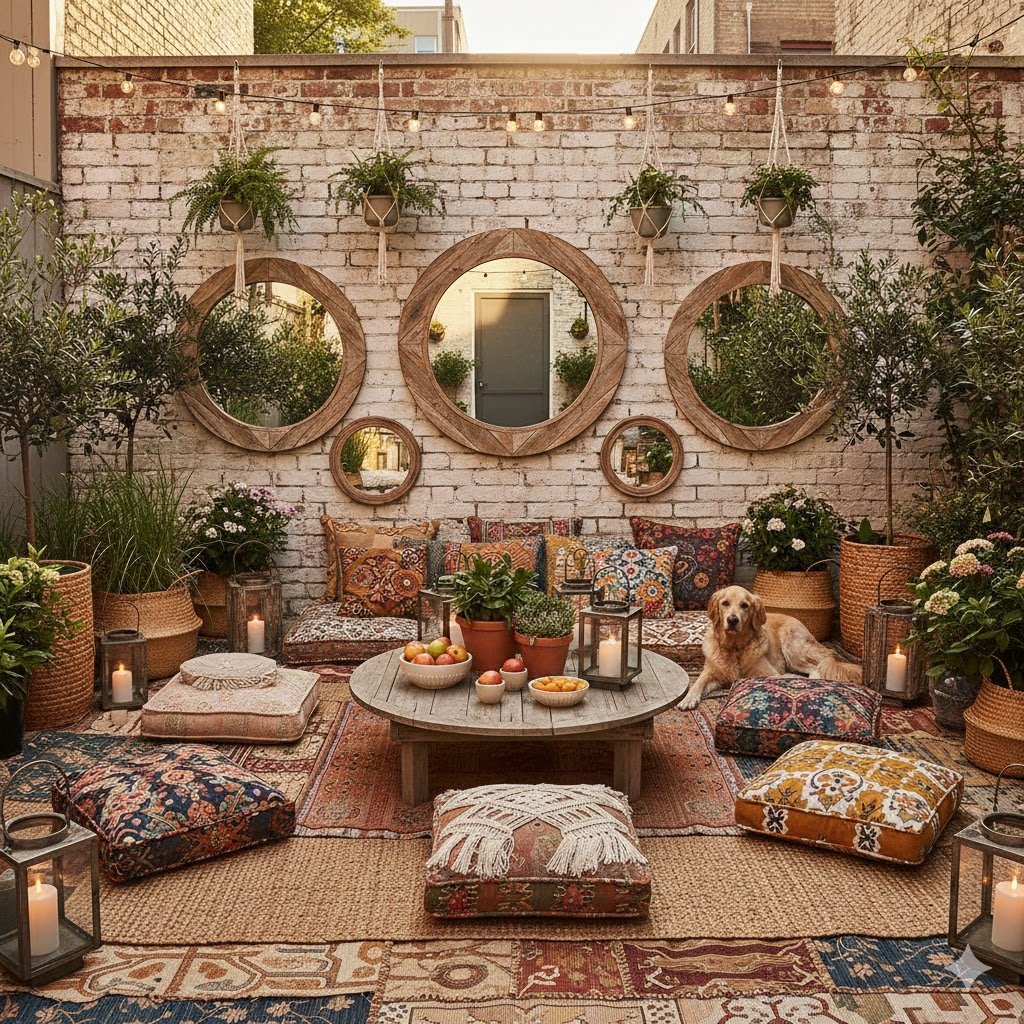 This is my favorite “designer secret” for small yards. Hang a large, weathered wood mirror on your fence or back wall. It reflects the light and the greenery, making your yard feel twice as deep.