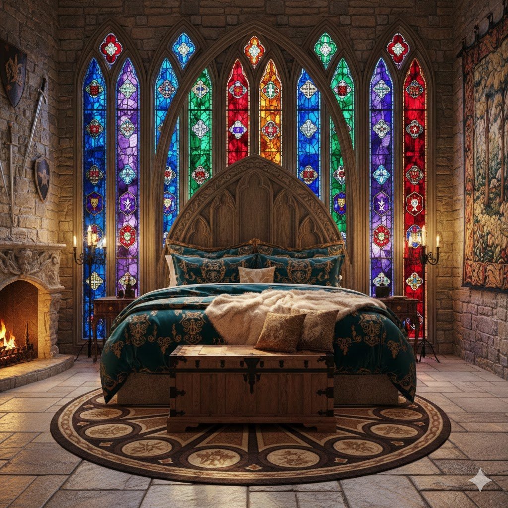 One of the defining architectural characteristics of medieval and gothic castles is the pointed arch. Introducing this signature shape subtly into your bedroom decor is a clever way to nod to the period’s architecture without needing structural changes. It introduces verticality and a beautiful sense of drama and formality.