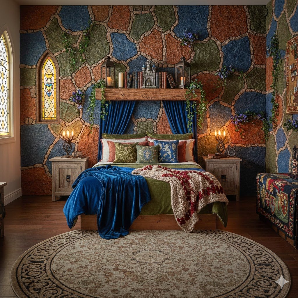 If we want the full Castlecore experience, we have to start with the foundation: stone. Few things add instant architectural weight and dramatic texture to a room quite like a rough, seemingly ancient wall. This feature immediately grounds the entire space, giving that crucial illusion of sleeping within a thick-walled fortress, and it’s arguably the most vital element in transitioning from “cozy” to “medieval.”