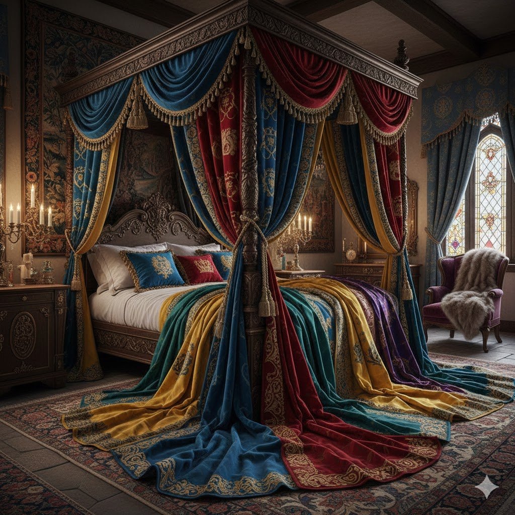One element that instantly screams royalty is the bed canopy. In historic castles, they weren’t just decorative; they provided warmth and privacy in large, drafty rooms. Today, they serve the same aesthetic purpose, turning a standard mattress and frame into a grand, intimate sleeping chamber fit for a monarch.
