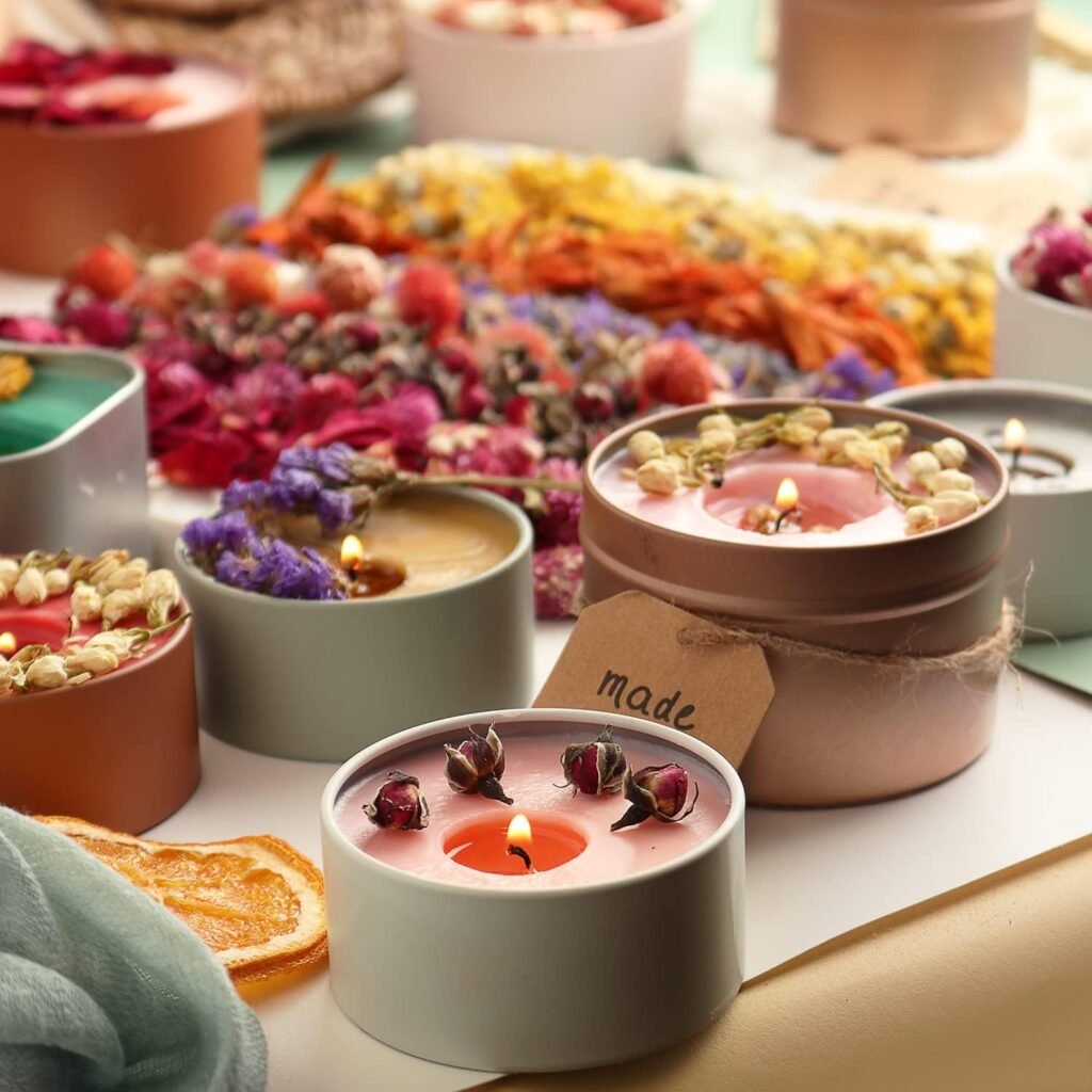 You’ll usually get soy wax flakes, essential oils, wicks, candle tins or jars, and a selection of dried flowers. The instructions walk you through the melting, scenting, and decorating process. Some kits also include labels or gift tags, making them ideal for birthday or Mother’s Day gifts.