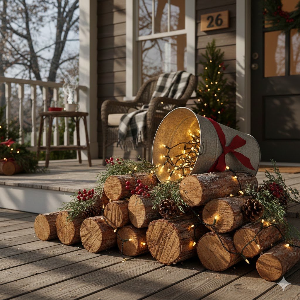6. Rustic Lighted Log Pile Decor
