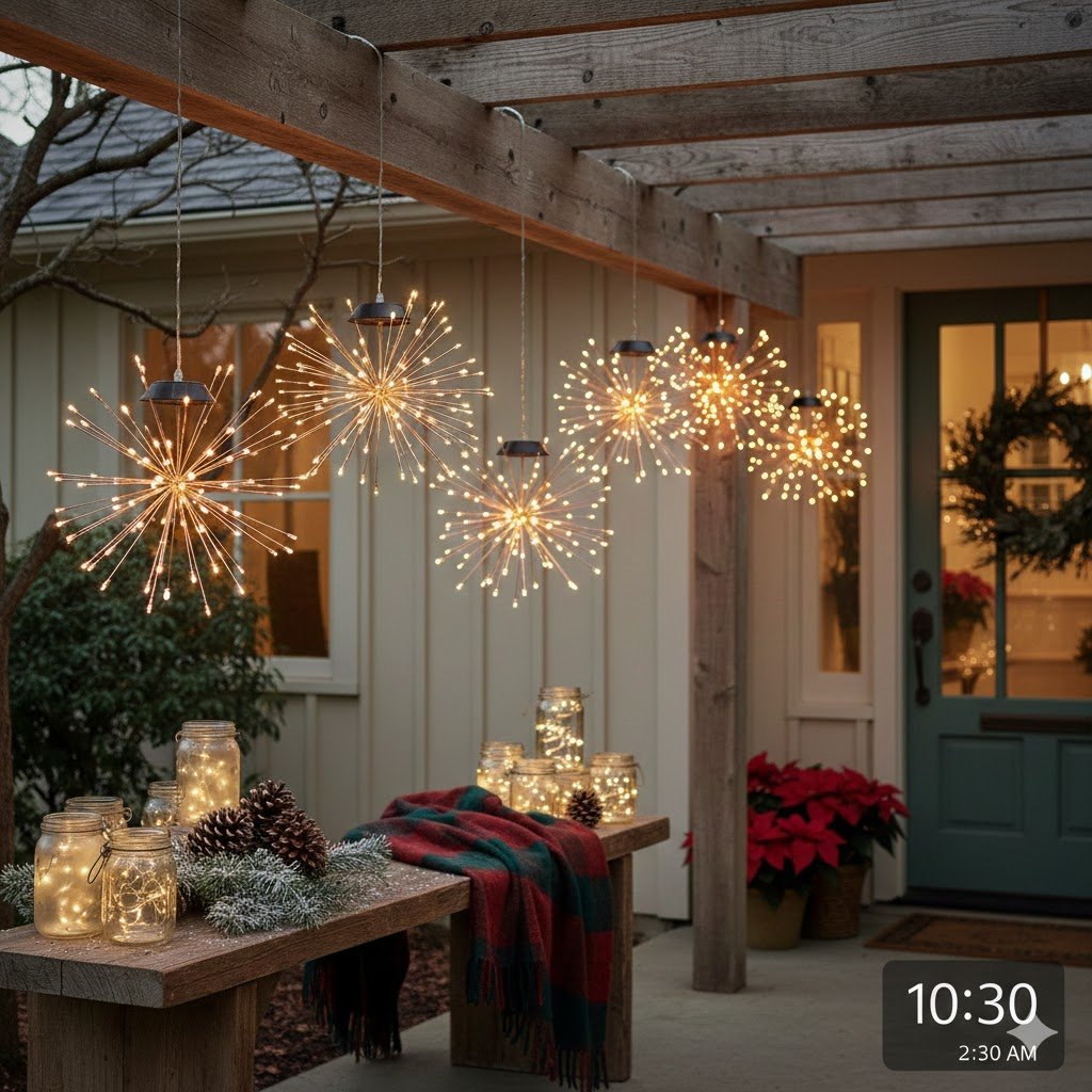 If you have a sunny porch but no outdoor outlets, solar is your best friend. I used to think solar lights were weak and pathetic, but the new starburst style (sometimes called “dandelion” lights) are actually quite bright. They look like little fireworks frozen in time.