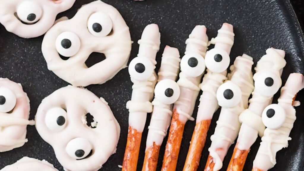 Sweet, salty, and spooky – these white chocolate-dipped pretzels are a crowd favorite.