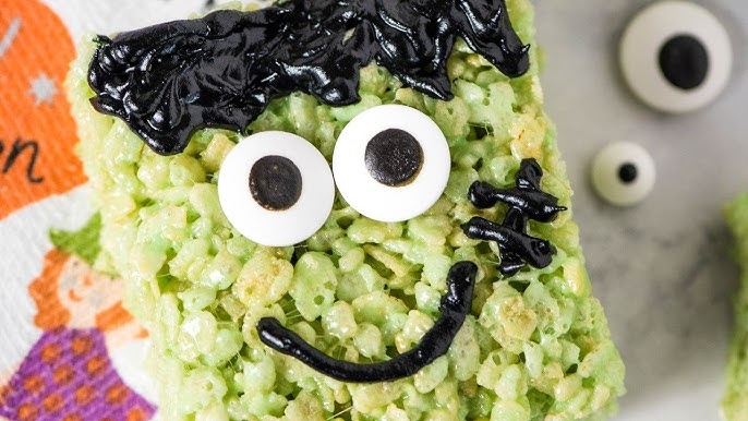 - Quick Recipe: Dip the top of Rice Krispie treats in green melted candy. Use black decorating gel to draw hair, a mouth, and scars. Add candy eyes.