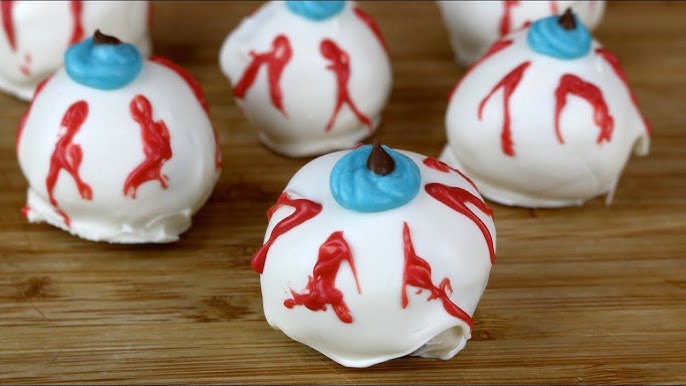 - Quick Recipe: Roll chocolate truffle mixture into balls. Dip in white chocolate and add a candy eye on top. Use red gel icing to draw “veins.”
