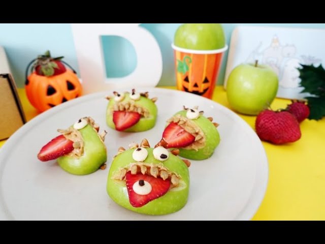 - Quick Recipe: Cut green apples into wedges. Spread peanut butter between two wedges and insert sunflower seeds for teeth. Add a strawberry slice for a tongue and candy eyes on top.