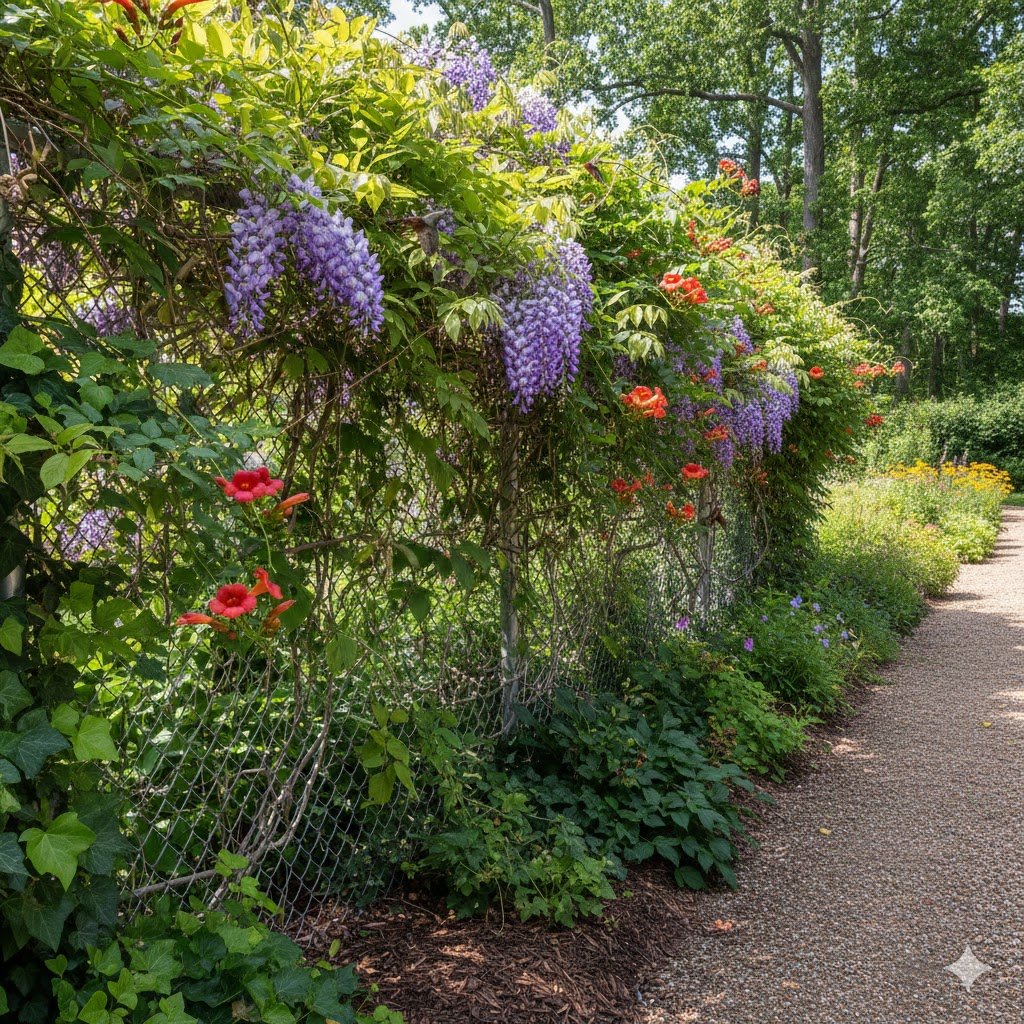 If you’re staring at an ugly chain-link fence, I feel your pain. It’s the “sweatpants” of fencing—functional, but not exactly stylish. The good news is that chain link is basically a giant trellis just waiting for some greenery. However, do not—I repeat, do not—plant Wisteria or Trumpet Vine unless you want to spend the rest of your life fighting a plant that wants to eat your house.