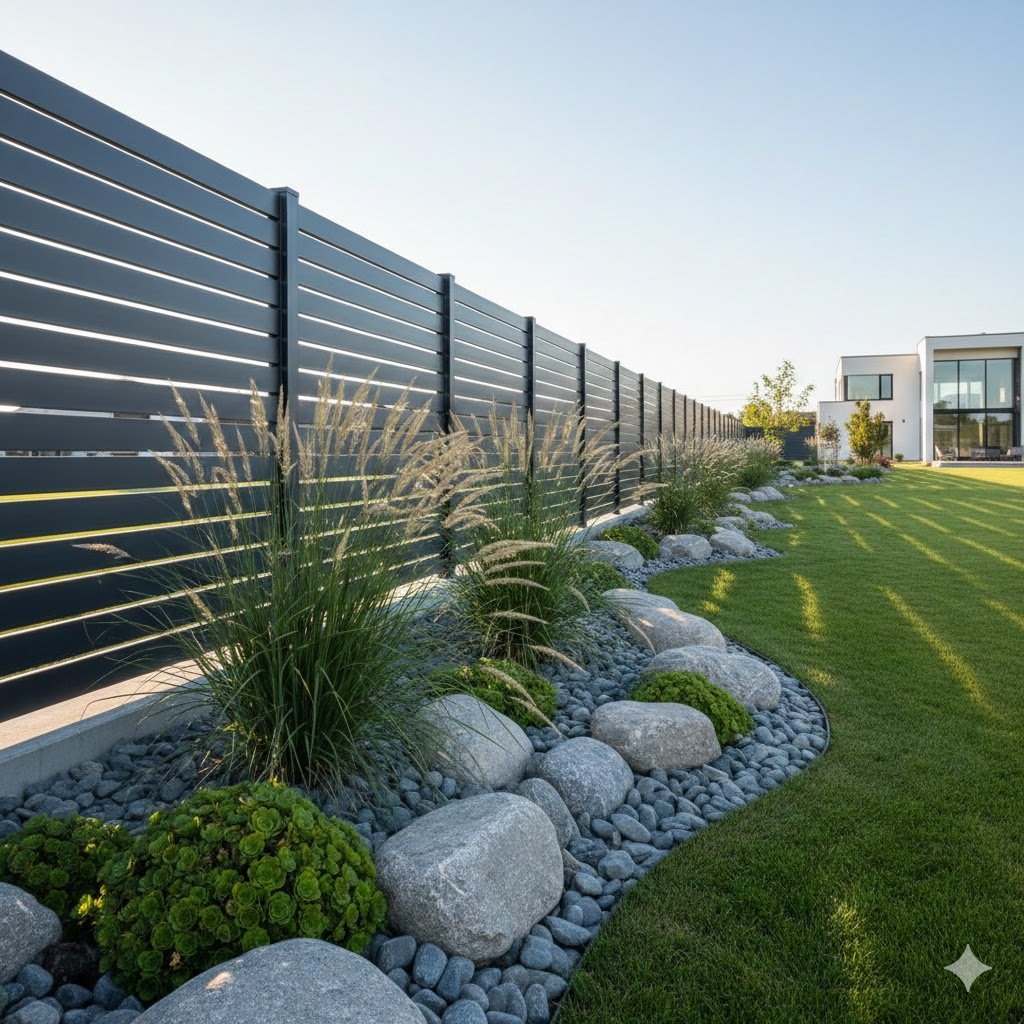 To make this look professional, clear out the grass along the fence and lay down some heavy-duty landscape fabric. Then, dump in a few inches of Mexican Beach Pebbles or large river stones. Don’t use that cheap “pea gravel” from the hardware store; it just ends up in your lawn and ruins your mower blades. Go for the bigger, smooth stones. It creates a high-contrast look that makes the green of the grasses really “sing.”