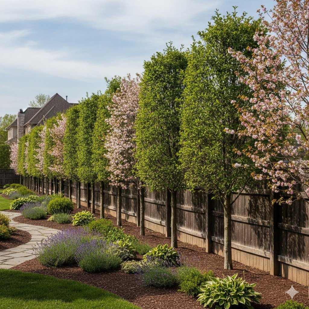 Japanese Maples are the crown jewels of the fence line. They don’t grow at a terrifying speed, and their canopy stays relatively compact. I planted a ‘Bloodgood’ variety in a corner where two fences met, and the deep burgundy leaves against the natural wood look like a million bucks. Plus, they provide “dappled shade,” which is perfect if you want to grow hostas or ferns underneath them.
