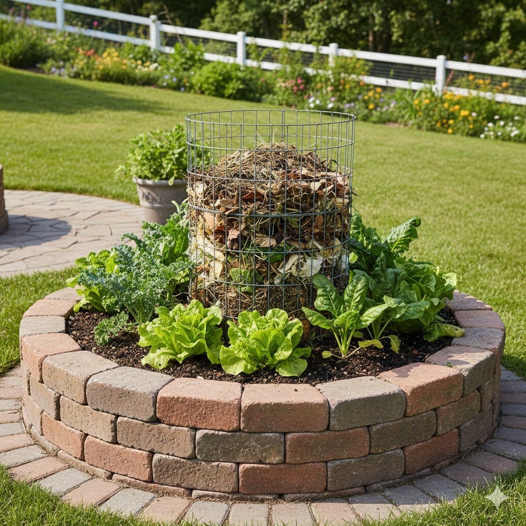 To build the outer wall, you can use stones, bricks, or even woven branches. The wall should be about waist-high. The center composting basket is usually made of chicken wire. As you add kitchen scraps and water to the center basket, the nutrients leach out into the surrounding soil, feeding your plants directly.