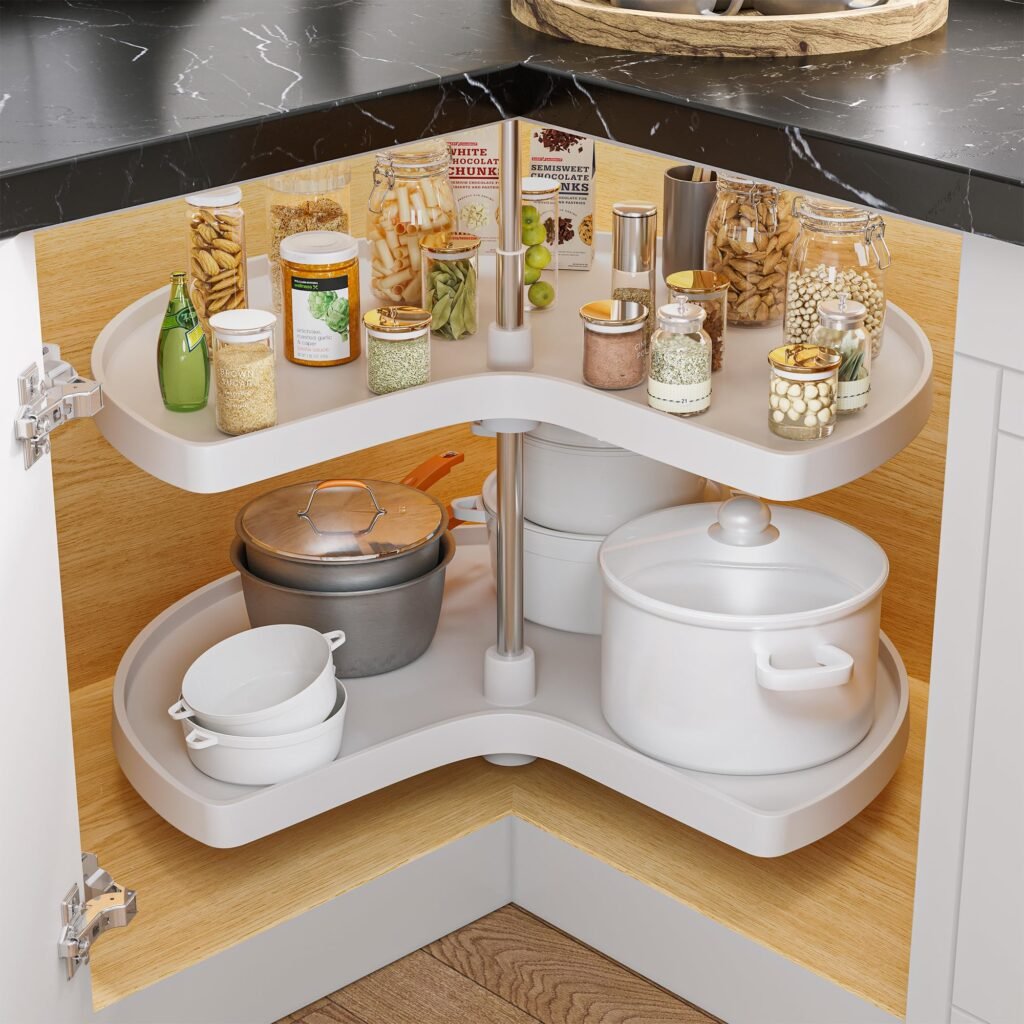 Lazy Susans come in various sizes and materials, including wood, plastic, or metal. Some even feature multiple tiers for double the storage. You can place one in your fridge, under the sink, or even in upper cabinets to make better use of space and improve accessibility.