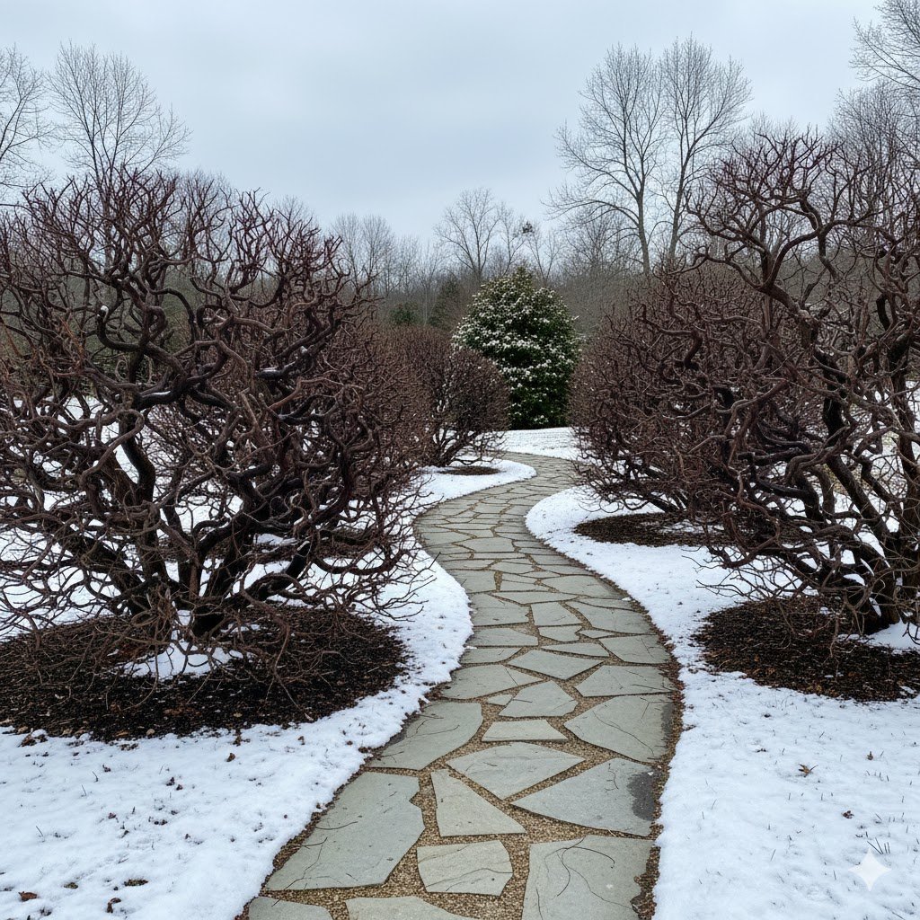 This is arguably the most “interesting” plant on this list. Also known as the Contorted Filbert, this shrub is grown almost exclusively for its winter silhouette. While the leaves are on it in the summer, it looks a bit messy. But in the winter, it reveals a crazy, tangled mess of corkscrew-twisted branches that look like a piece of living sculpture.