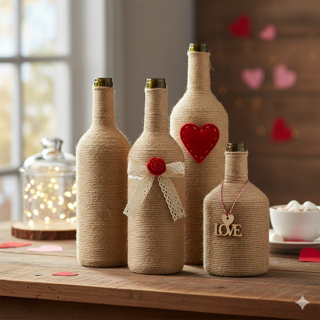 To add a Valentine’s touch, you can use a different color of twine or a thin ribbon to “stitch” an “X” and an “O” over the top of the base layer. Alternatively, you can hot glue a small wooden heart to the center of the bottle.