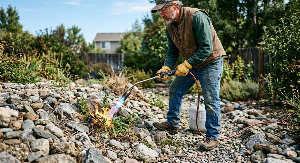 If you want to feel like a structural engineer with a grudge, get yourself a propane weed torch. This is, hands down, my favorite way to deal with weeds in rock beds. There is something deeply satisfying about incinerating a patch of crabgrass with a flame-thrower. It’s fast, it’s chemical-free, and it’s effective for killing the plant and any seeds sitting on the surface of the rocks.