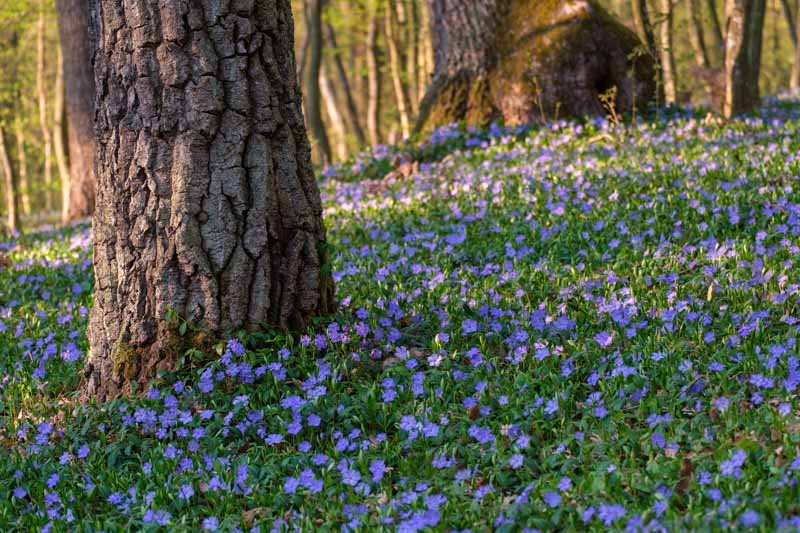 Periwinkle is an old-fashioned favorite that’s earned its reputation. Its shiny evergreen leaves stay attractive year-round, and its soft violet-blue flowers appear in spring, adding a pop of color to shaded areas.