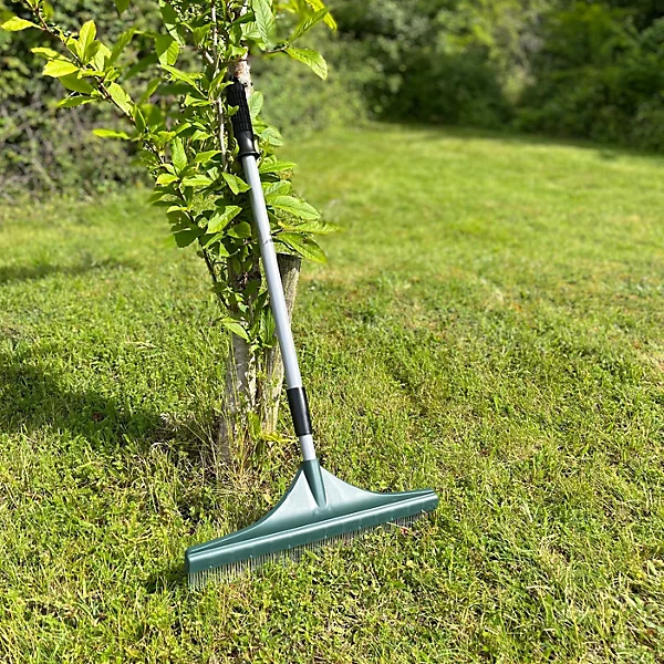 A sticker rake is one of those tools I didn’t know I needed until I had it. It’s specially designed to pull up sticker burrs and their seeds from the surface of your yard. I use it after mowing or when there’s morning dew to help the burrs cling to the rake.