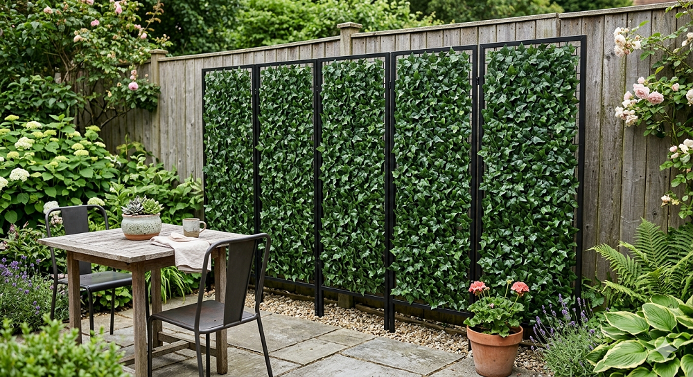 I know, I know. “Artificial” is a dirty word for some gardeners. But hear me out. Sometimes you need privacy right now, and you don’t have three years to wait for a hedge to grow. Faux ivy panels have come a long way. The good ones look surprisingly realistic from a few feet away, and they provide 100% coverage the second you zip-tie them to your railing.