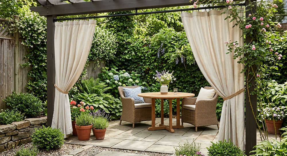Not every privacy screen needs to be made of hard materials. I’ve found that high-quality outdoor curtains can create a “cabana” vibe that feels incredibly luxurious. This is especially useful if you already have a pergola or a porch overhang. You just hang a rod, slide on some weather-resistant panels, and suddenly you have a private room.