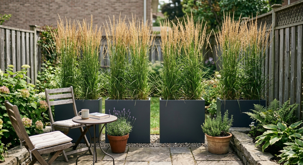 Sometimes the best screen isn’t a wall at all—it’s something that moves. I’m a huge advocate for using tall ornamental grasses like Miscanthus or Calamagrostis (specifically ‘Karl Foerster’) to create a living “veil.” When you plant these in narrow, elevated troughs, you get eye-level privacy that still lets light and air filter through. It’s the difference between standing behind a brick wall and standing behind a sheer curtain.