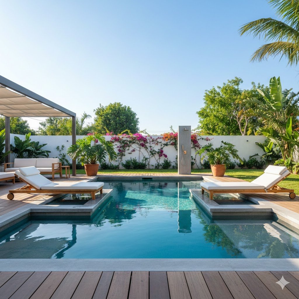 Adding a pergola or cabana over your pool provides a shaded retreat while boosting the luxurious vibe. Choose a modern wooden or metal structure with flowing curtains for a resort-like feel.