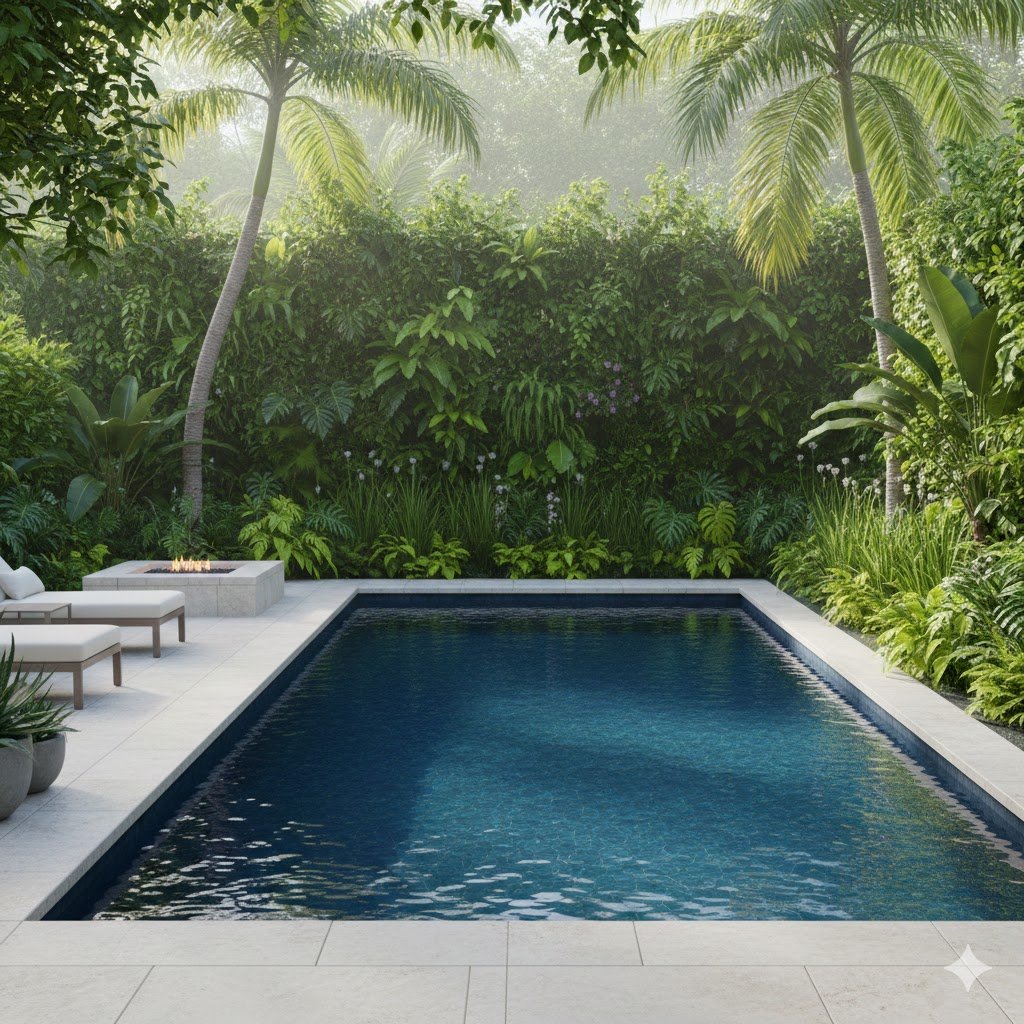Transform your small pool area into a tropical paradise with palm trees, lush ferns, and bamboo fencing. These elements create a private escape reminiscent of a luxury beachside resort.