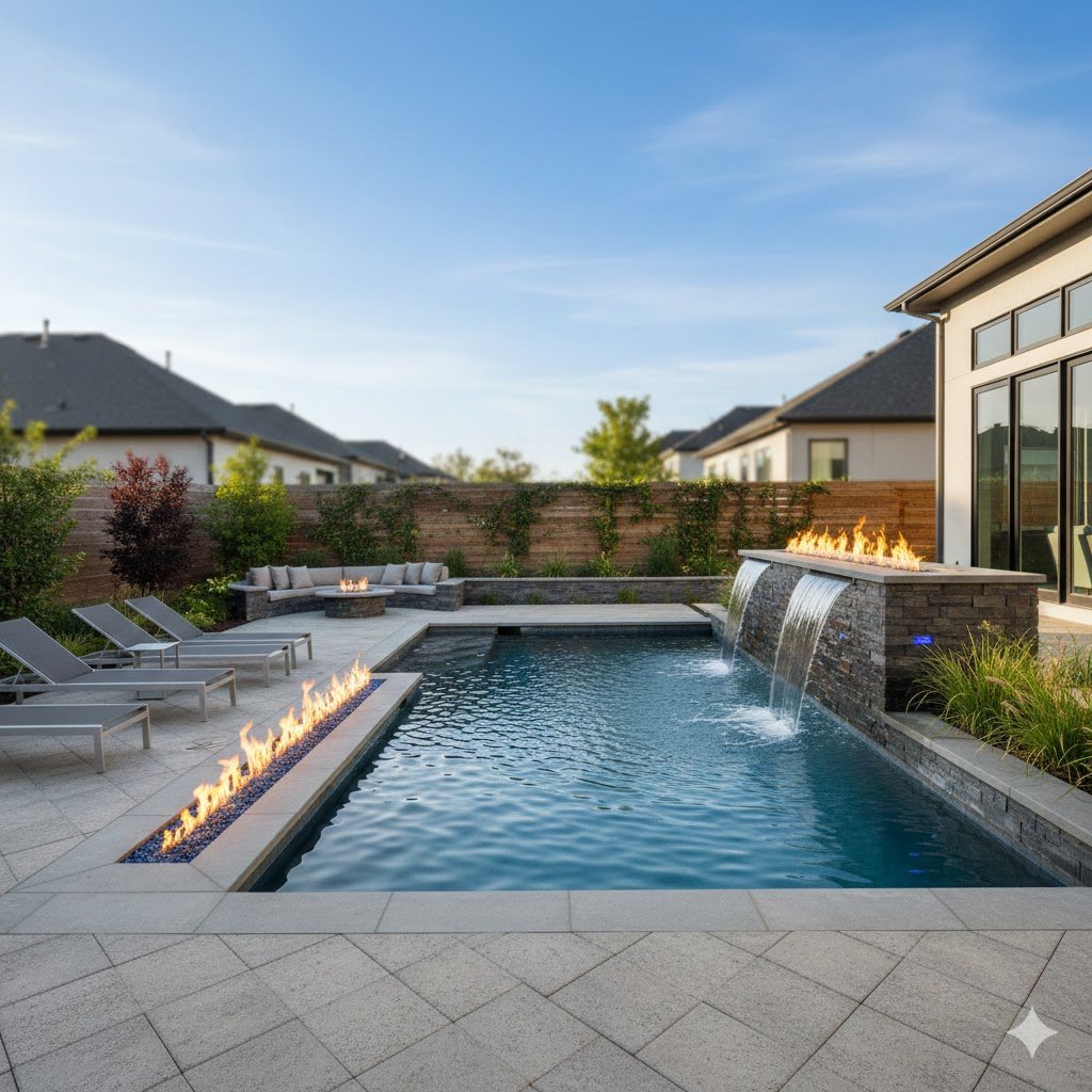 The combination of fire and water creates a dramatic, high-end effect. Fire bowls or torches around the pool contrast beautifully with the water’s reflective surface.