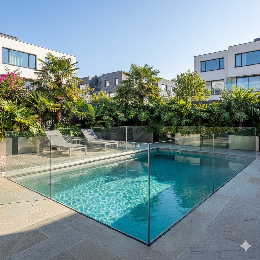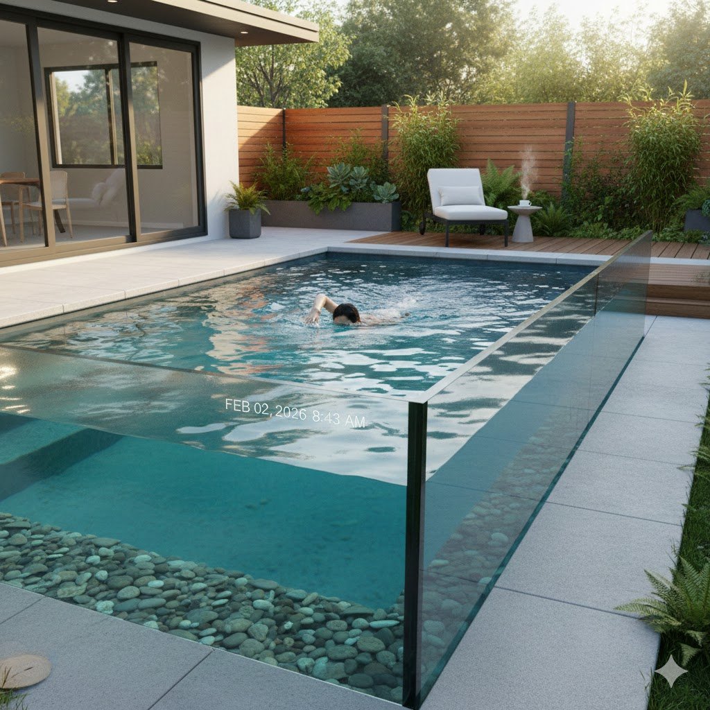 A glass-walled pool is the epitome of modern luxury. With at least one transparent wall, this design adds an ultra-sophisticated and visually striking element to any backyard. The illusion of floating water enhances the elegance and makes the space feel more open.