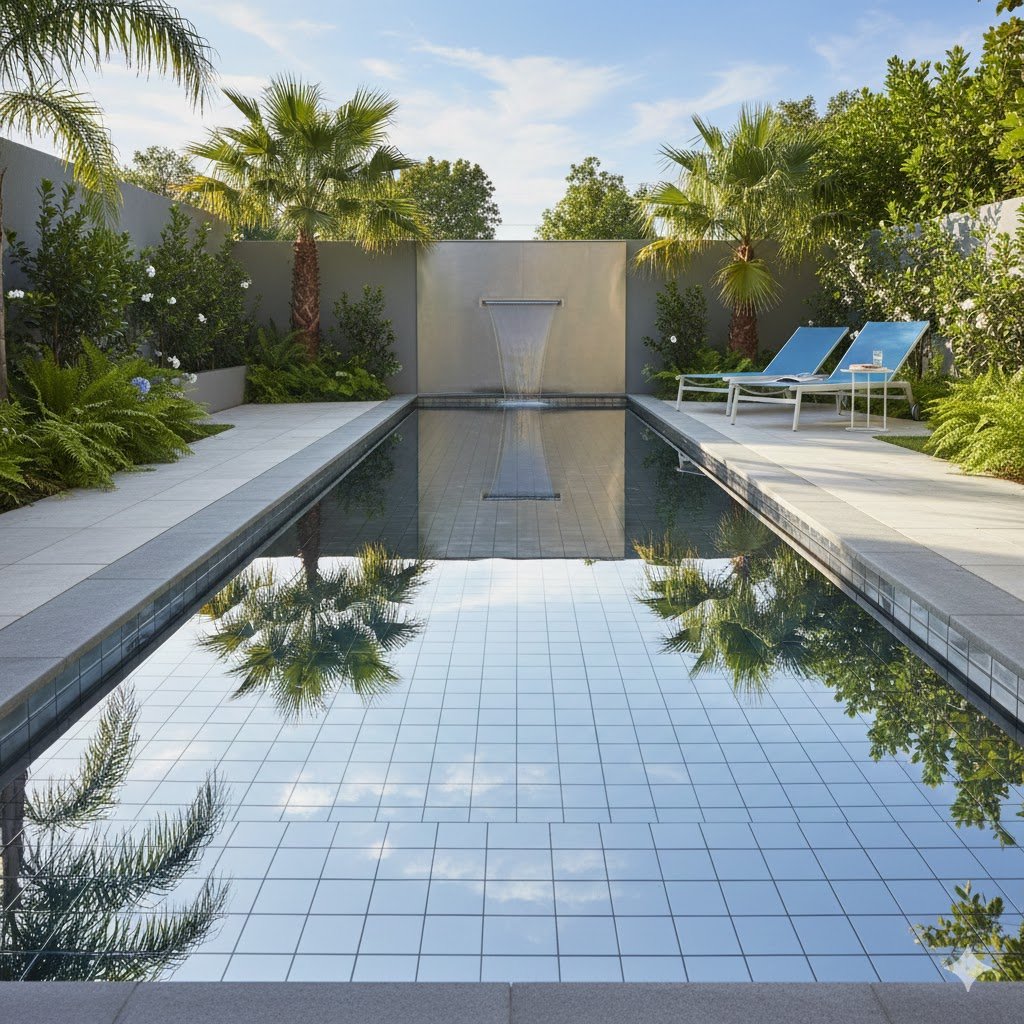 Reflective pool tiles create a stunning mirror-like effect that enhances depth and sophistication. Choosing high-gloss tiles in shades of blue or silver makes a small pool appear larger.
