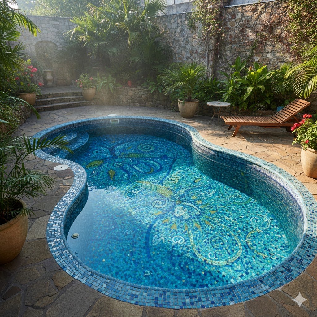 Mosaic tiles are a simple way to infuse personality and luxury into a small pool. With shimmering blues, deep emeralds, or even metallic hues, they reflect light beautifully and create a rich, opulent effect.