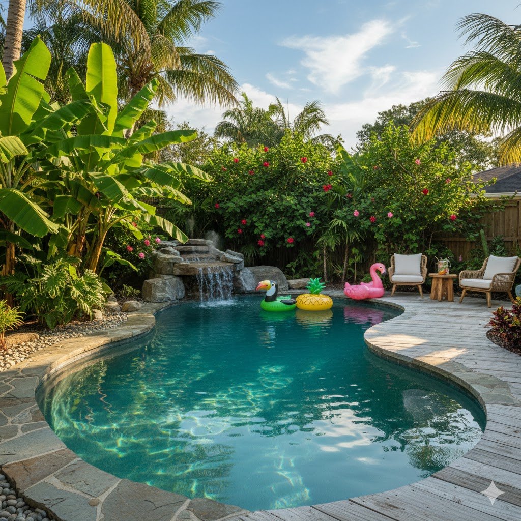 Adding tiki torches and natural stone accents will enhance the exotic aesthetic. A hammock or woven lounge chairs complete the tropical look.