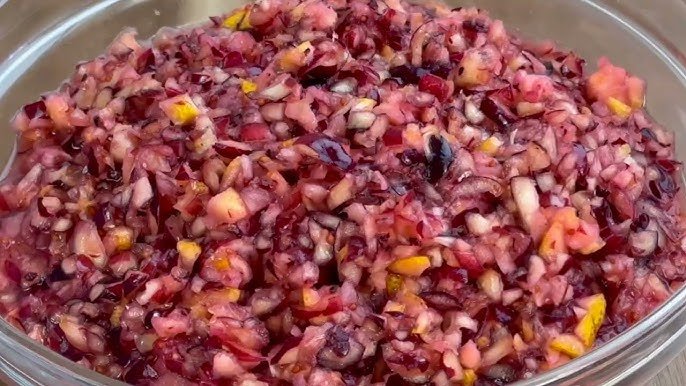 - Pulse 2 cups fresh cranberries, 1 orange (peeled), and ½ cup sugar in a food processor.