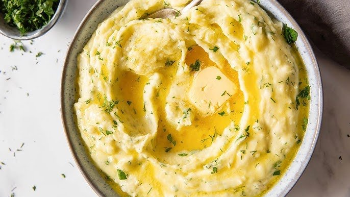 - Boil 2 lbs potatoes until soft, mash with ½ cup butter, ½ cup cream, 3 cloves roasted garlic, and fresh thyme.