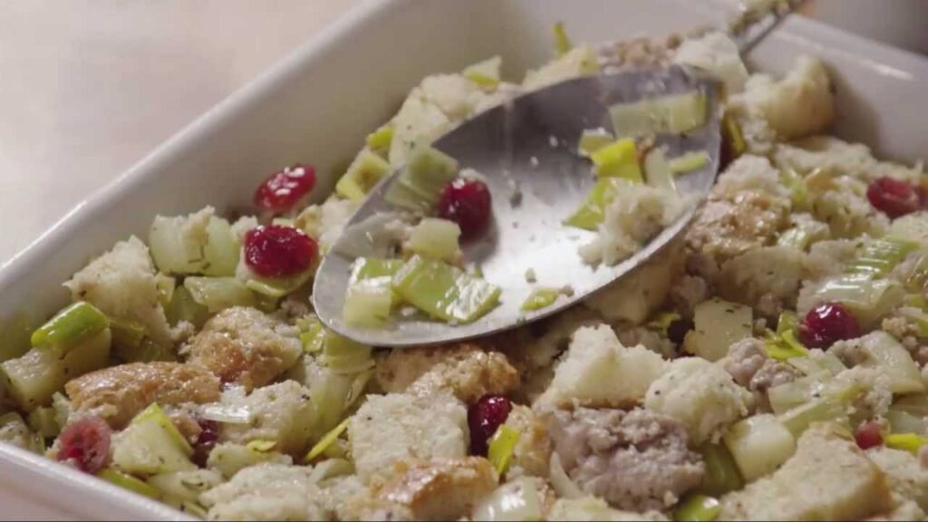 - Sauté ½ lb sausage with onion and celery, mix with 6 cups bread cubes, 1 chopped apple, herbs, and 1 cup chicken broth.